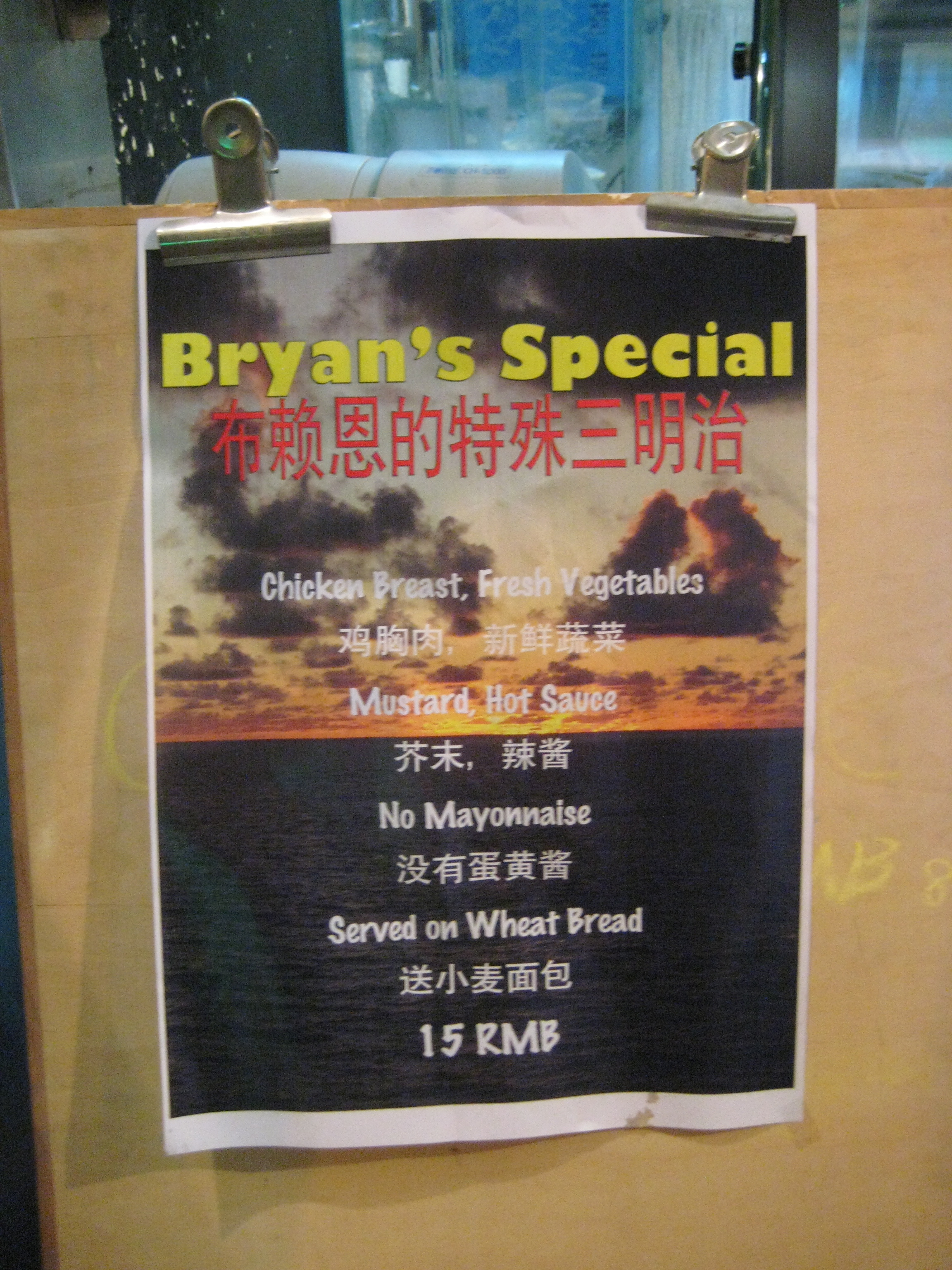 Today at a small sandwich stand in Shanghai called Sarnies, the store employees unveiled Bryan’s Special. My sandwich is chicken breast, fresh vegetables, mustard, and hot sauce served on wheat bread. After reading the ingredients, you might ask “What’s so special?” So here is the story…
